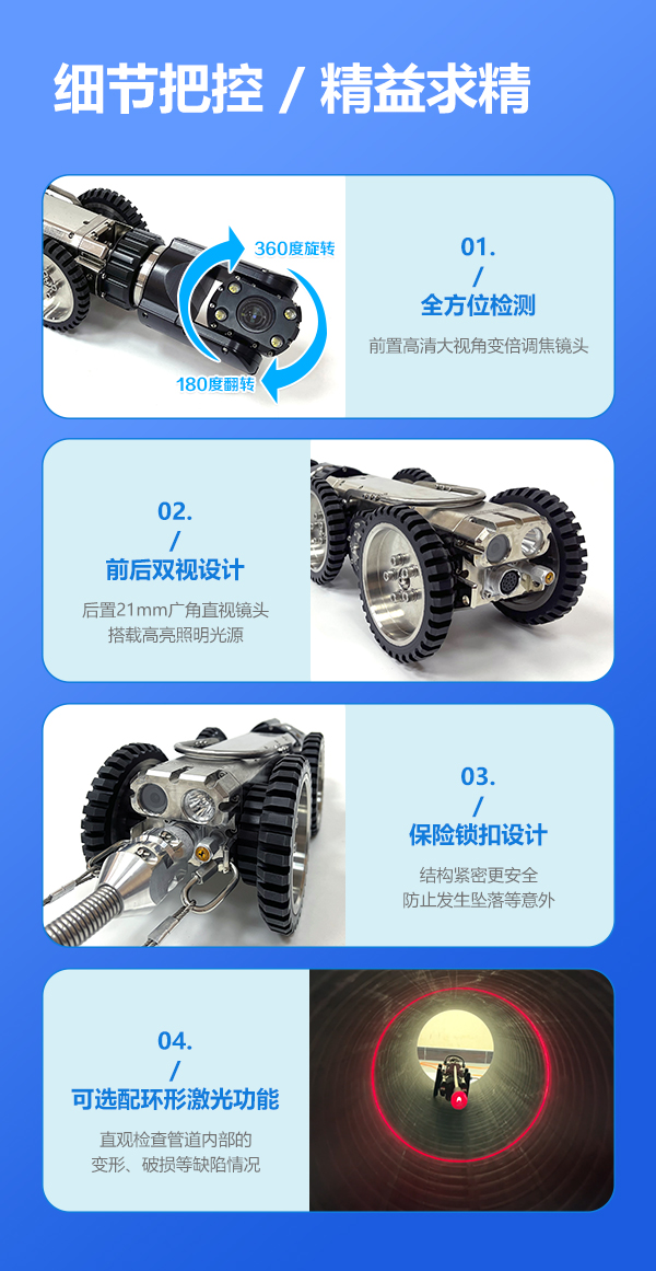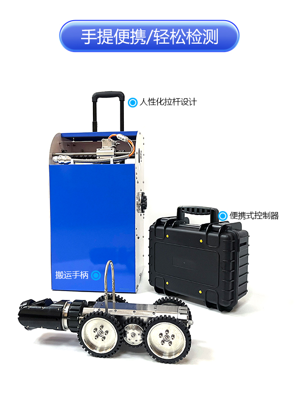 GTR120B系列工業管道檢測機器人是一款具備變倍功能的超清管道內部檢測機器人,能夠代替人工進入 管道內部,通過搖桿控制 爬行器的進退、轉彎以及鏡頭的旋轉、翻轉,輕觸式按鍵進行變倍調焦、拍錄、回放等操作,為判斷提供及時、詳細的圖像物證。采用變倍調焦鏡頭,不受空間大小限制,200萬高清鏡頭,還原細節,前后雙視設計,實施呈現倒車影像;搭載計米裝置,輔助判斷缺陷位置,中英文實時標注,及時記錄缺陷信息。產品適用于150mm~2000mm直徑的遠距離管道檢測,用于檢測管道內部的裂紋、腐蝕、焊縫、異物等缺陷。