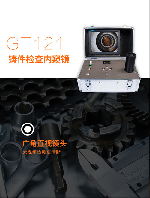 GT121系列便攜式鑄件檢查內窺鏡是一款箱式便攜,鏡頭一體式操作,方便快捷,能夠快速對被檢物體內部進行圖片、視頻記錄。單人可操作,使檢測工作更高效!175度廣角直視鏡頭,高清畫質實施呈現,是鑄件檢測的必備之選!