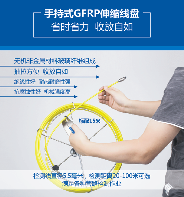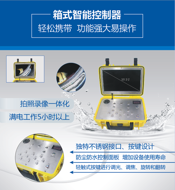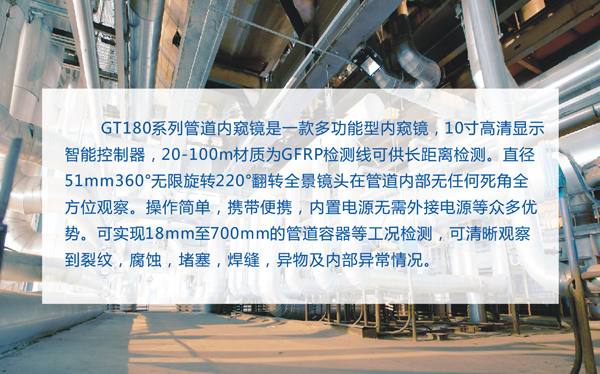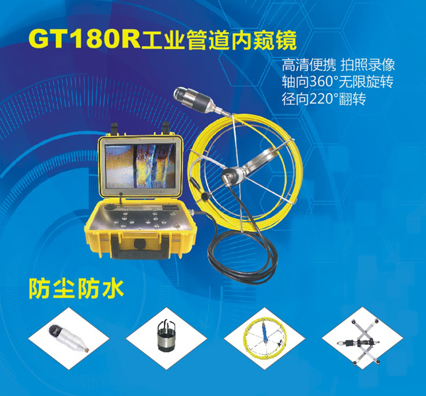簡介—— GT180系列管道內窺鏡是一款多功能型內窺鏡,10寸高清顯示智能控制器,20-100m材質為GFRP檢測線可供長距離檢測