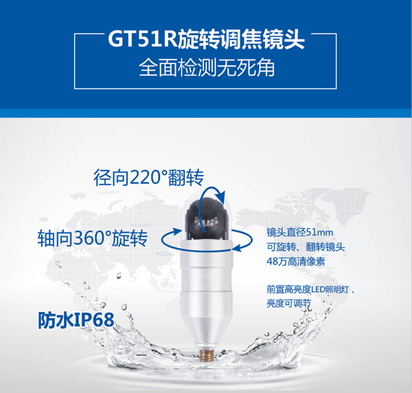 GT180系列工業管道內窺鏡是一款多功能型內窺鏡,10寸高清顯示智能控制器,20-100m材質為GFRP檢測線可供長距離檢測。直徑51mm360°無限旋轉220°翻轉全景鏡頭在管道內部無任何死角全方位觀察。