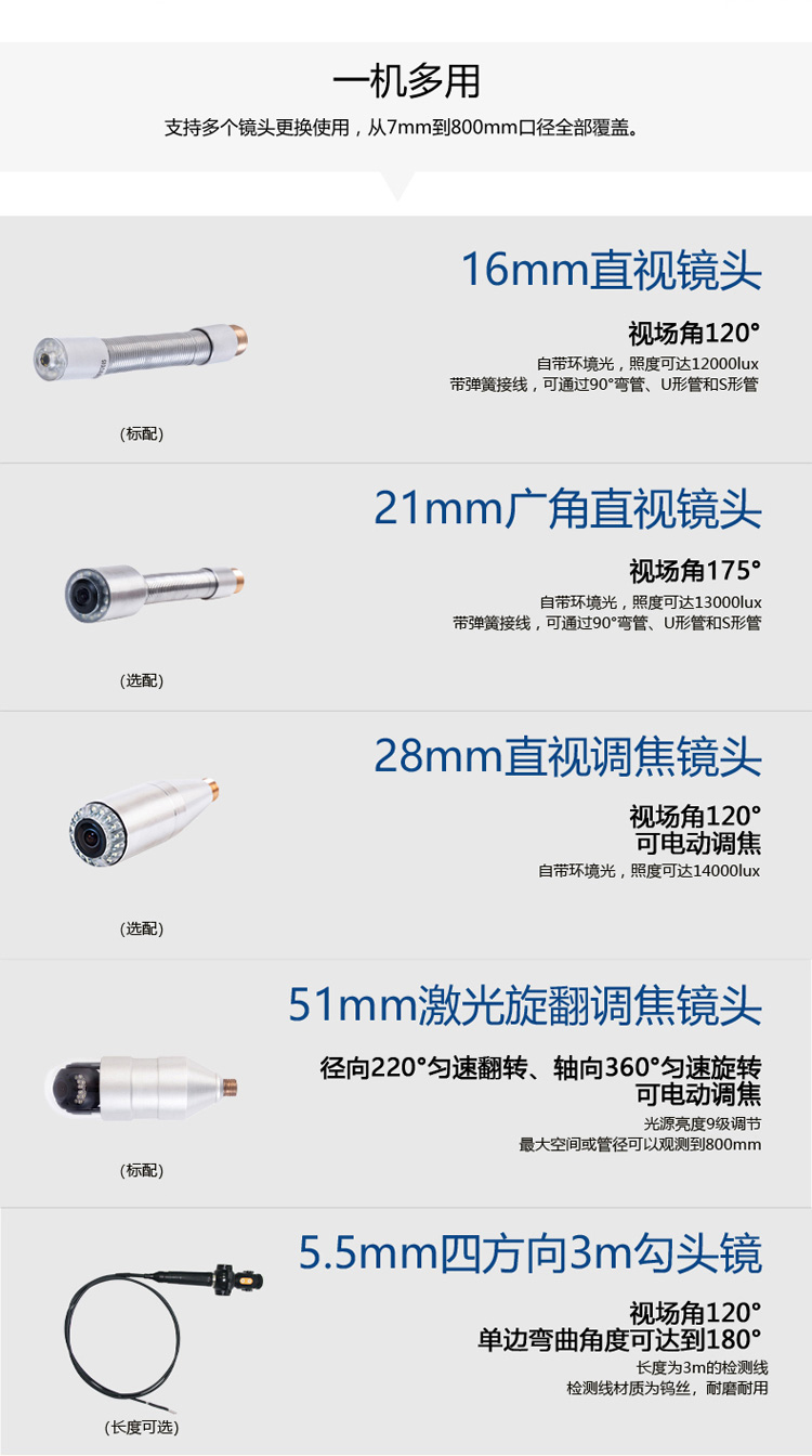 EXPERT系列工業(yè)視頻內窺鏡實現(xiàn)了管道鏡與勾頭鏡的完美結合,一機多用,兼容性強。鏡頭通過旋轉翻轉、調焦、激光測量、異物打撈等功能,能夠高效的對不同直徑的管道內部進行檢測、診斷,并實時記錄管道內部工況。檢測過程中圖像支持中英文命名及抓拍功能,支持WIFI熱點連接,可隨時進行遠程數(shù)據傳輸,在線查詢資料等,方便快捷!