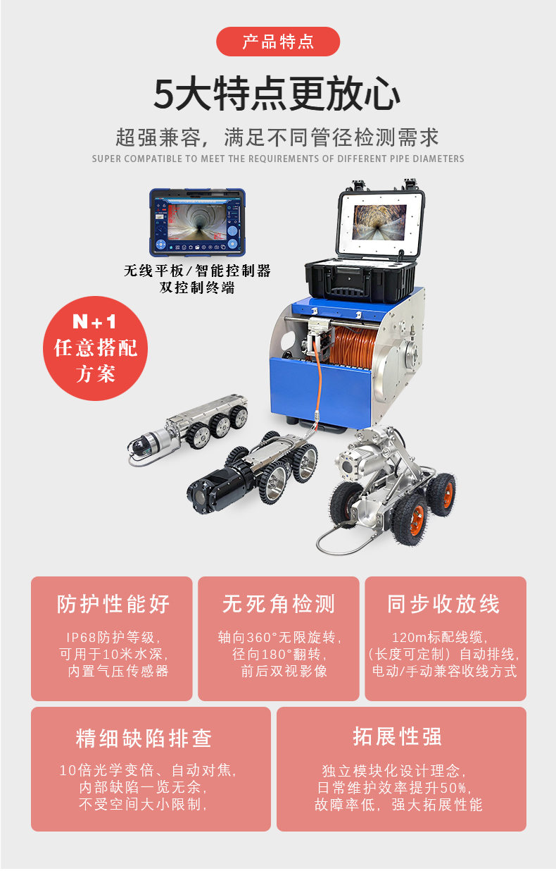 TR200PRO系列CCTV管道檢測機器人通過電纜與控制系統連接后,響應控制系統的操作命令。如:爬行器的前進、后退、轉向、停止、速度調節;鏡頭座的抬升、下降、燈光調節;鏡頭的旋轉、翻轉、調焦、變倍、前后視切換等。在檢測過程中,控制系統可實時顯示錄制鏡頭回傳的畫面以及爬行器的狀態信息。前置高清變倍攝像頭,支持自動對焦,200萬像素高清實時傳輸;IP68級超強防水,可用于10米水深,氣密保護,內置氣壓傳感器,有壓力指示燈。支持生成檢測報告,通過管道檢測信息管理系統,對檢測數據進行采集、上傳、存儲和分析等。